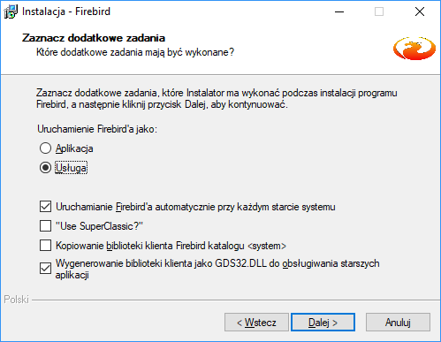 - Zainstalować Firebird do foldera C:\Firebird_3